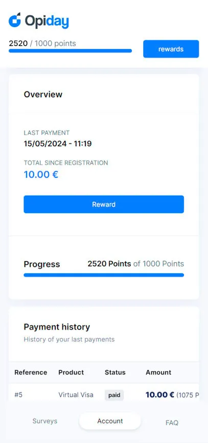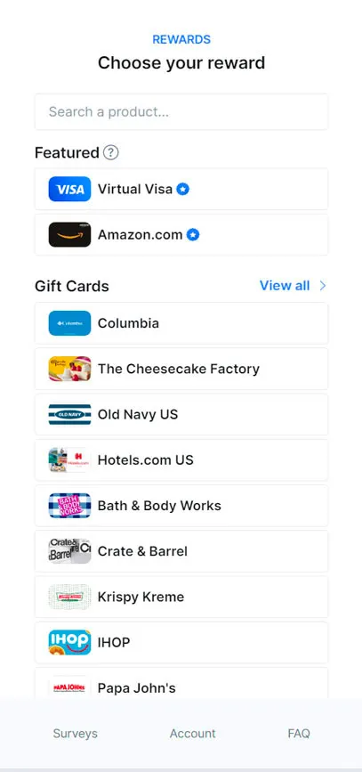 Setelah anda melengkapkan tinjauan yang mencukupi, anda akan berpeluang memilih ganjaran yang anda suka daripada katalog jenama kami (lebih daripada 130 jenama bergantung pada negara). Lebih banyak tinjauan yang anda selesaikan, lebih banyak yang anda perolehi. Mendaftar keluar adalah pantas, mudah dan selamat.